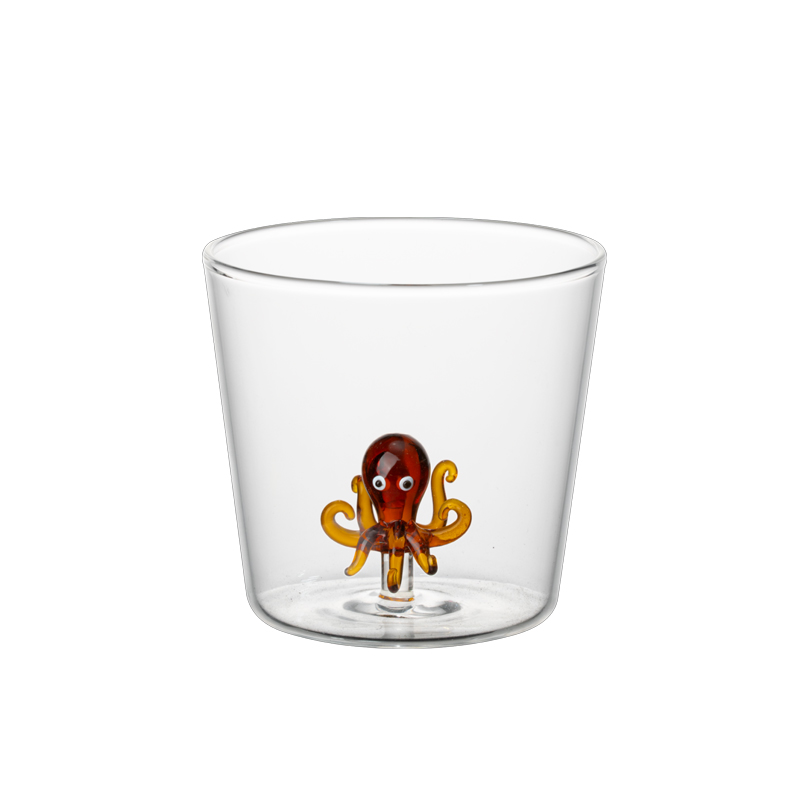 Η πραγματική μαγεία, όμως, κρύβεται στο εσωτερικό τους: μέσα στη διάφανη φόρμα φιλοξενείται ένα παιχνιδιάρικο γυάλινο γλυπτό, σχολαστικά διαμορφωμένο στο χέρι. Ένα διακριτικό λουλούδι ή ένα μικροσκοπικό ζωάκι μετατρέπει κάθε γουλιά σε μια μικρή στιγμή έκπληξης και χαράς.