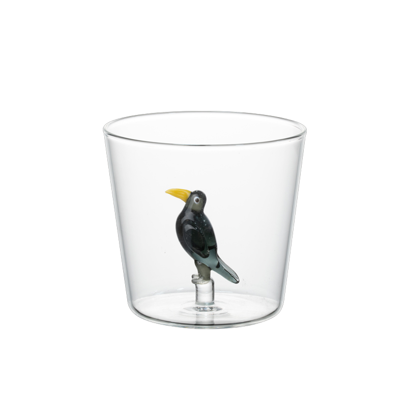 Η πραγματική μαγεία, όμως, κρύβεται στο εσωτερικό τους: μέσα στη διάφανη φόρμα φιλοξενείται ένα παιχνιδιάρικο γυάλινο γλυπτό, σχολαστικά διαμορφωμένο στο χέρι. Ένα διακριτικό λουλούδι ή ένα μικροσκοπικό ζωάκι μετατρέπει κάθε γουλιά σε μια μικρή στιγμή έκπληξης και χαράς.