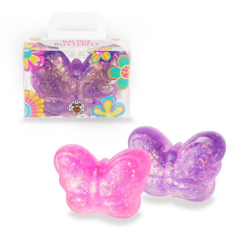 Αυτή η εντυπωσιακή πεταλούδα με γκλίτερ είναι ιδανική για στύψιμο και ζύμωμα, και επιστρέφει σιγά σιγά στο αρχικό της σχήμα. Νιώστε την καταπραϋντική, αντιστρες επίδραση! Γέμιση: Μαλτόζη.
